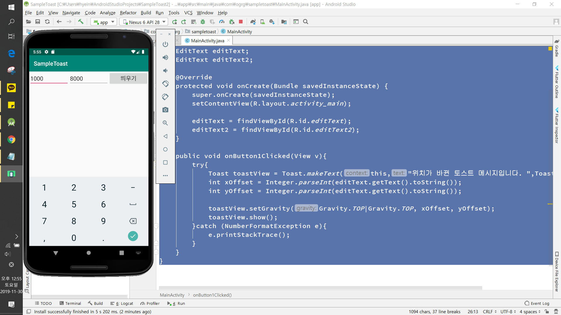 - 이렇게 정의한 XML 정보는 자바 코드의 setView() 메서드를 이용해 토스트 객체에 설정