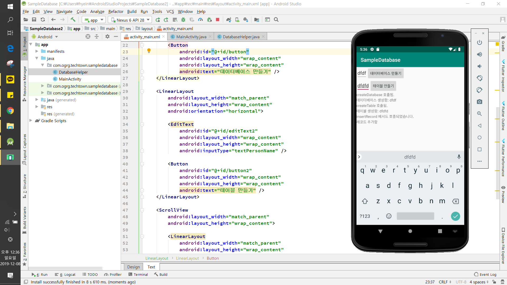- 레코드를 추가하는 SQL문은 결과 값을 받지 않으므로 "create table..." SQL 문과 "insert into ..."SQL문을 만들어 execSQL() 메서드로 실행