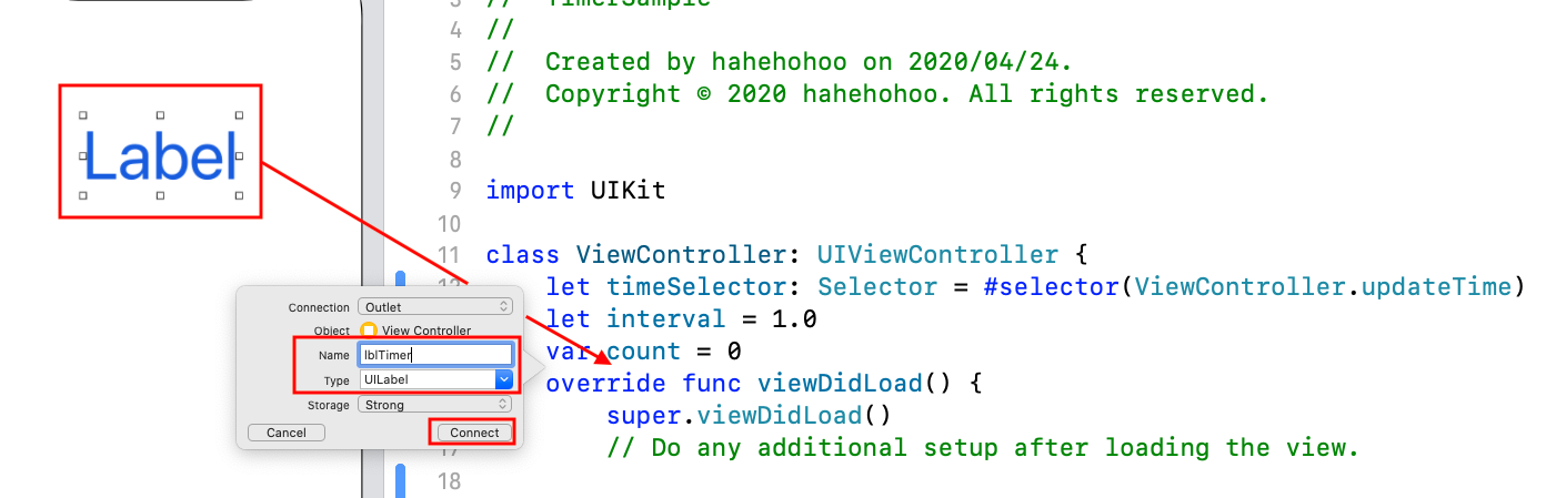 - 연결 설정 창에서 이름(Name)은 lblTimer. 유형(Typer)은 UILabel로 지정합니다.